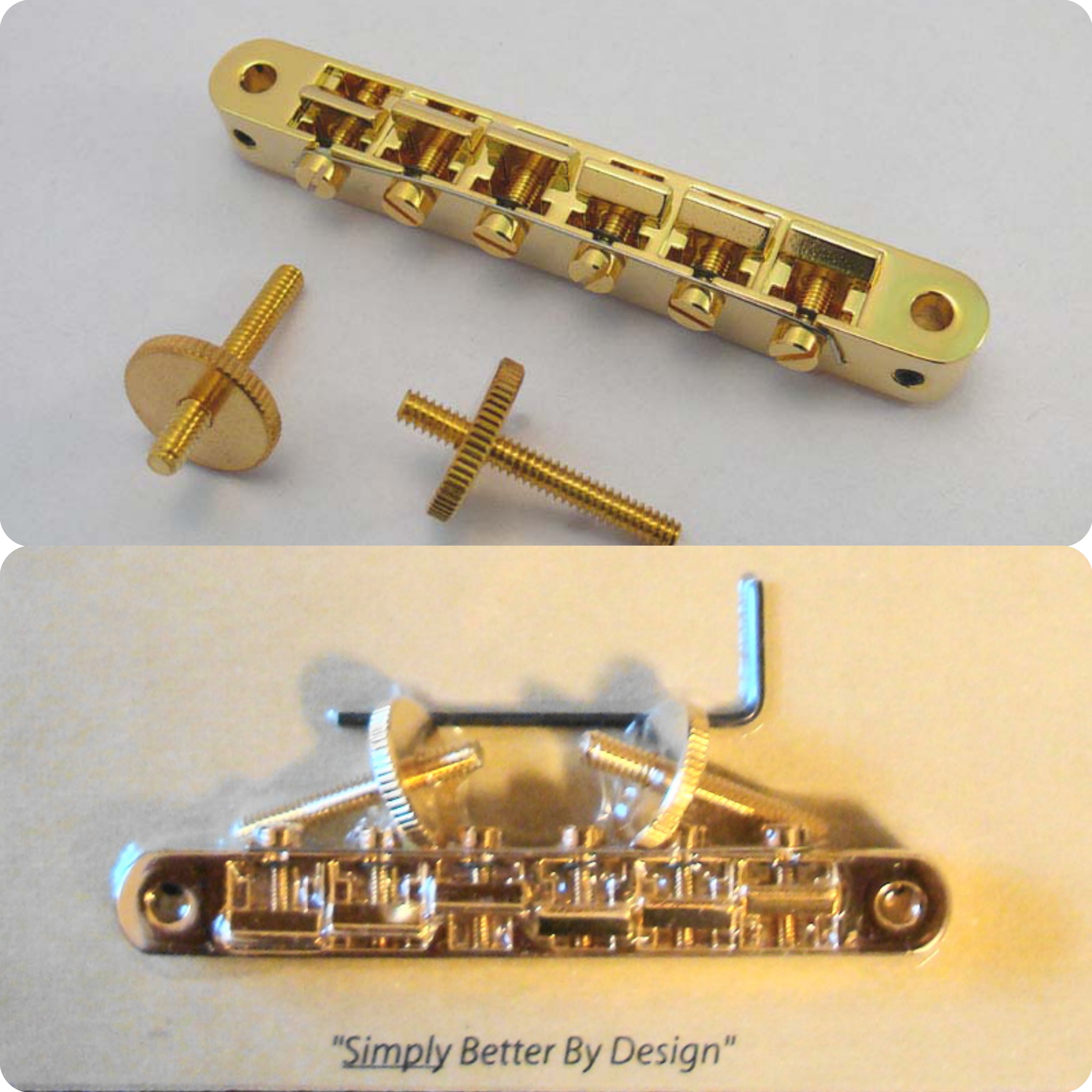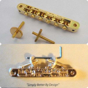 This model is the exact replacement for the bridges found on older or vintage instruments originally fitted with ABR-1 style bridges. This locking model has the complete appearance of the vintage part, but has many upgrades including more intonation range, and saddles that are “engineered in” solid, preventing “lift” against the retainer wire. Retrofit for most Vintage and reissued USA guitars without modification. Extra tight construction eliminates rattles and improves sustain.