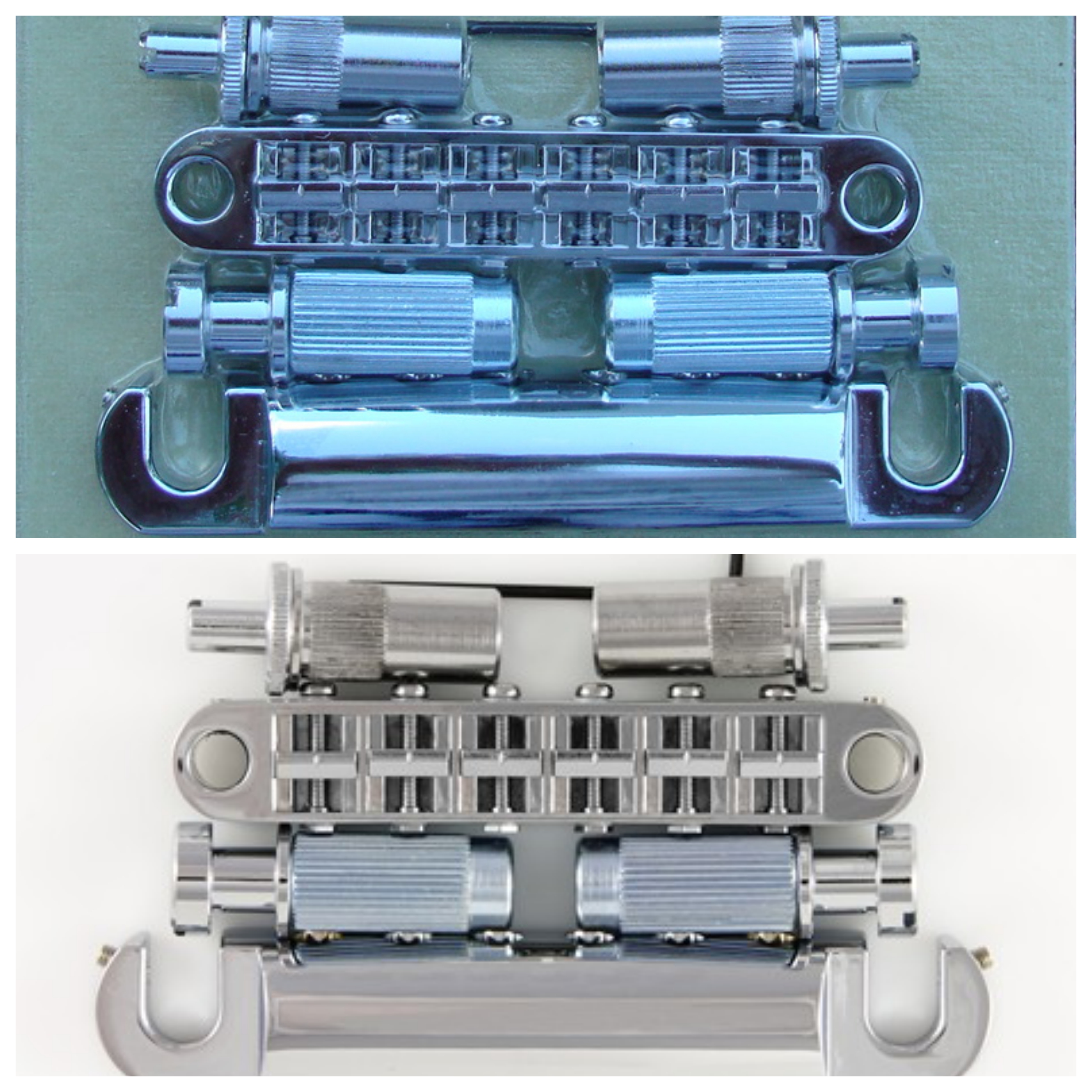 The Locking Nashville style bridge with many improvements including intonation adjustment on the pickup side; phillips head saddle adjustment screws, and pre-notched saddles for quick installation. Equipped with large post, metric thread, and pre-notched saddles. This model fits most guitars made overseas. Direct retrofit for many USA guitars without modification.