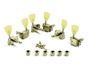 This Kluson® 3 per side tuning machine set has imitation pearloid keystone style buttons and the improved 15:1 gear ratio for more stable and accurate tuning. The housing and button style are period correct for 1956 – 1960 production dates. These feature the standard string thru post. This set comes complete with both bass and treble side tuners, 8.8mm O.D. vintage bushings with 1/4 inch I.D. and mounting screws needed for installation.